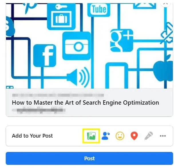 Primero, comparte la publicación en Facebook normalmente. Una vez que veas la miniatura incorrecta, edita la publicación. Luego, haz clic en el icono de foto verde en la pantalla de edición.