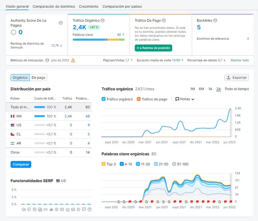 Herramientas como Semrush te permiten analizar páginas web y te proporcionan información demográfica y de SEO. Tu meta debería ser comparar esa información con los datos que has recaudado sobre tu audiencia y mirar en qué diferencien. He aquí un ejemplo de un análisis de dominio básico usando Semrush: