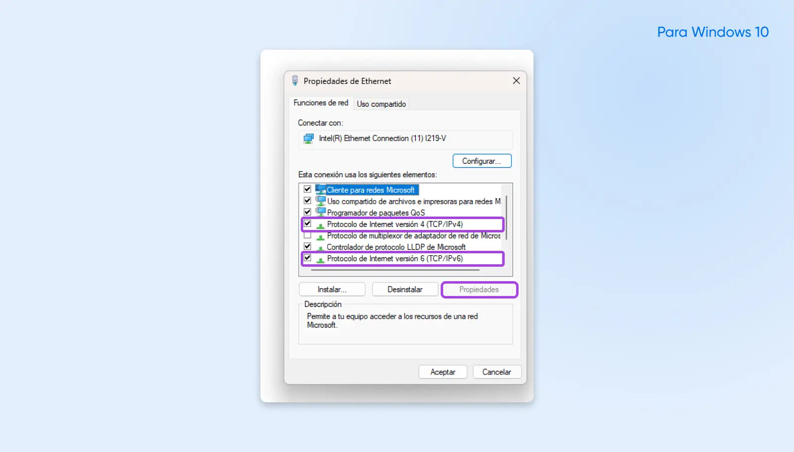 - Elige si deseas utilizar direcciones IPv4 o IPv6 para tus configuraciones de DNS. Luego haz clic en ‘Propiedades’.