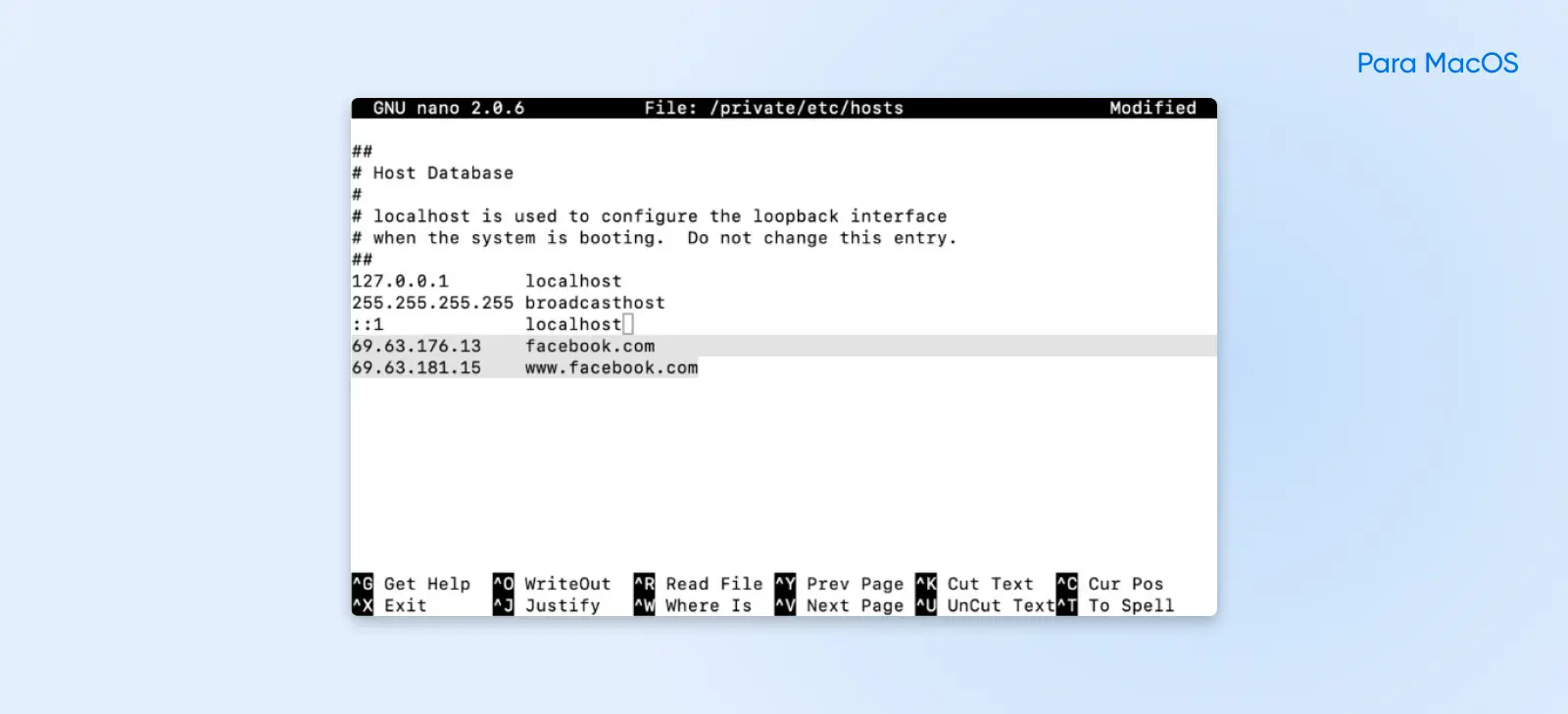 sudo nano /private/etc/hosts Borra todos los sitios web bajo la línea “::1”.