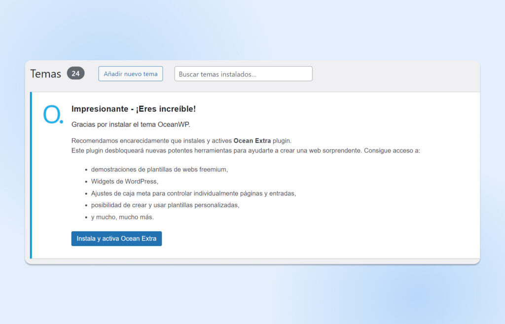 Una vez que la página se actualice, deberías ver una notificación en la parte superior de la página de Temas que te pedirá que instales y actives Ocean Extra. Ocean Extra es un plugin relacionado con OceanWP que incluye funcionalidades adicionales.
