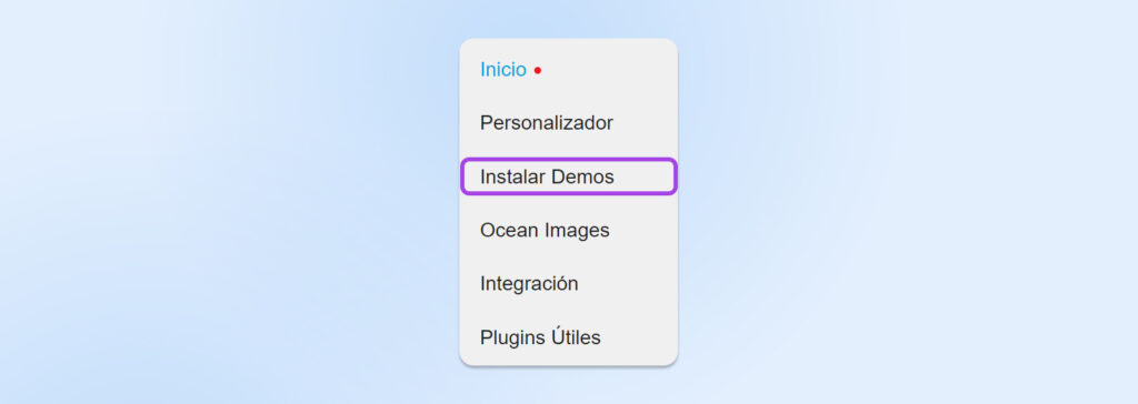Haz clic en OceanWP > Instalar Demos en la barra lateral: