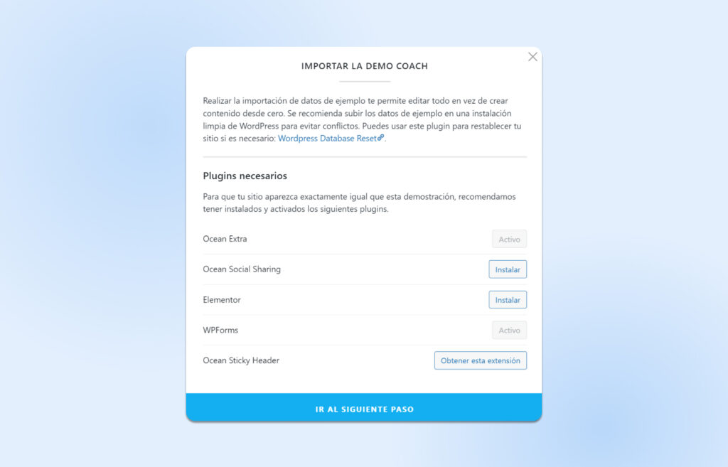 Haz clic en Importar en la plantilla Coach y sigue las instrucciones para agregar los plugins y plugins que harán que tu página de destino se parezca a la demostración. (Por cierto, se requiere una compra para Ocean Sticky Header).