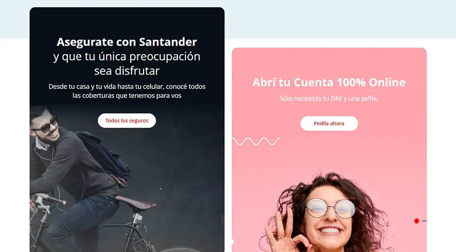Para que te hagas una idea de cómo se ve un CTA, echa un vistazo en la imagen de abajo. En este ejemplo, las llamadas a la acción son “Pedila ahora”, “Abrí tu cuenta 100% online” y “Asegúrate con Santander”: