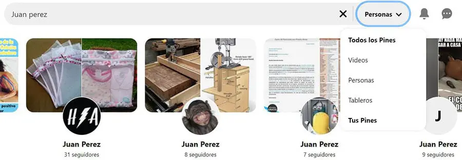 Puedes encontrar personas en Pinterest de la misma manera en la que encuentras tableros. Luego de escribir el nombre de usuario en la caja de búsqueda, selecciona Personas del menú desplegable.