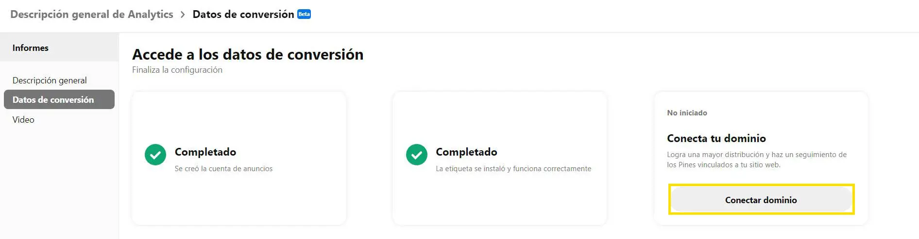 Mientras que tendrás acceso a cierta información de inmediato, para tomar una ventaja completa, necesitarás conectar tu dominio. Desde el panel de Business, puedes navegar a Analytics > Datos de conversión. Luego haz clic en el botón Conectar Dominio, y luego en el botón Conectar junto a la sección Sitios web.