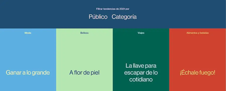 Primero, puede que quieras echar un vistazo a Pinterest Predicts. Este es un reporte altamente visual lleno de consejos sobre qué temas serán tendencia en un futuro cercano en varios nichos.