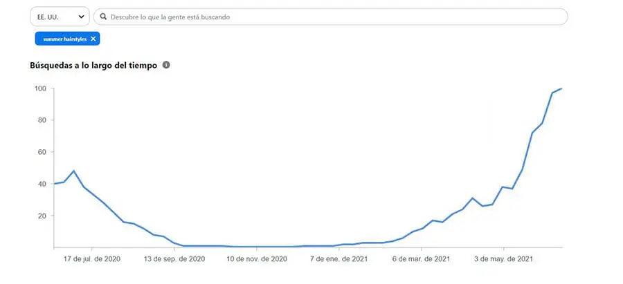 Además también querrás echar un vistazo a Pinterest Trends (disponible solo para EE. UU., Canadá y el Reino Unido por el momento). Esta herramienta está un poco más enfocada en el presente, entonces puedes usarla para descubrir qué es tendencia actualmente en Pinterest en diferentes categorías.