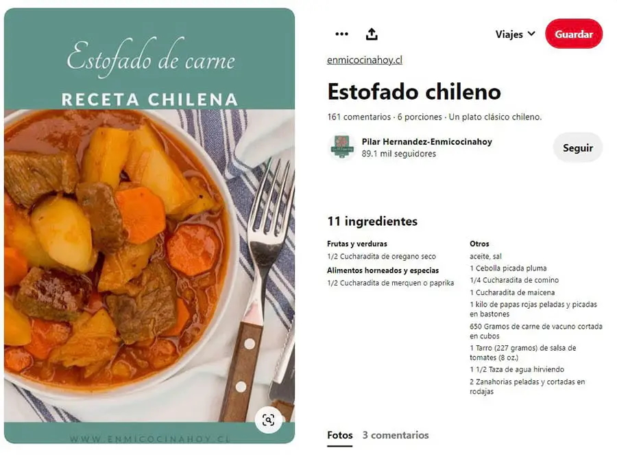 Mientras tanto, los Pines Detallados de Receta pueden incluir calificaciones, tiempo de cocción, una lista de ingredientes y cualquier otra información que desees incluir. Si realizas cambios a la receta en tu sitio web, el correspondiente Pin Detallado se actualizará automáticamente.
