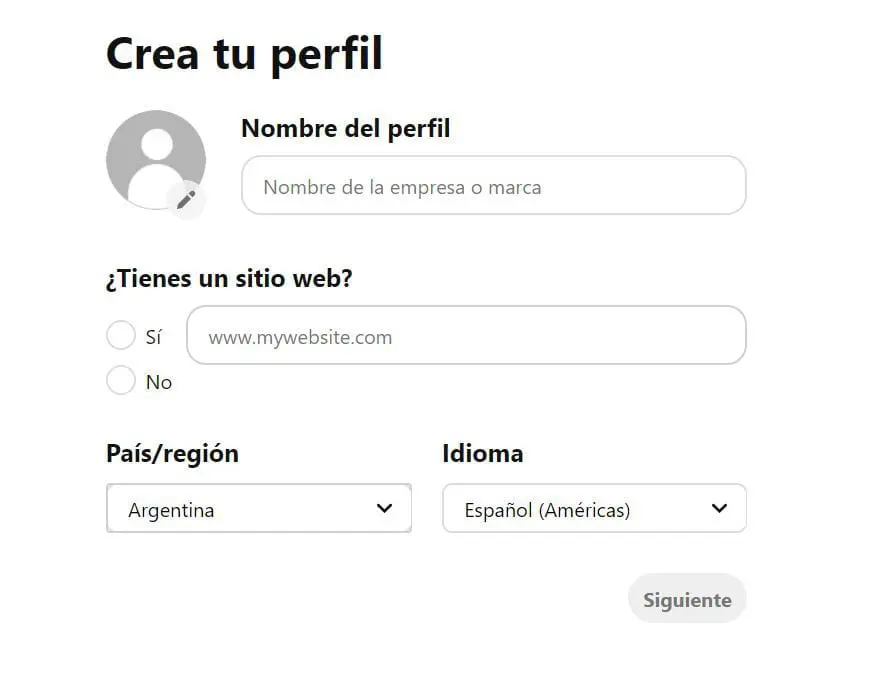 Para configurar tu cuenta Business, dirígete a Pinterest Business y haz clic en el botón ‘Regístrate’. Primero, se te pedirá que crees una cuenta o que inicies sesión en una cuenta existente. A continuación, serás llevado a esta pantalla, donde podrás comenzar a crear tu perfil.