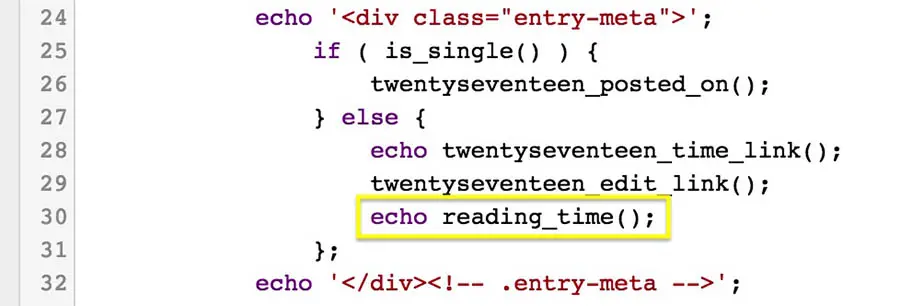 echo reading_time(); Por ejemplo, podrías añadirlo a los metadatos que aparecen junto a cada publicación. Cada tema está construido de forma diferente, pero típicamente encontrarás en ‘template-parts > post > content.php’