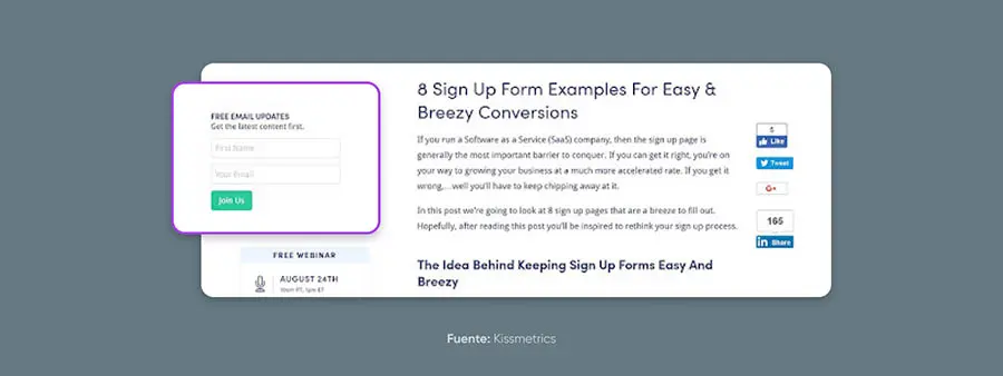 Esto parece algo obvio, pero necesitas proporcionarle a los visitantes de tu sitio web una manera en la cual suscribirse a tu lista de correos. Un formulario dedicado es una manera perfecta para hacerlo. Puedes diseñarlo para incluir cualquier información que desees, enlazarlo en ubicaciones prominentes en tu sitio y dejarlo hacer su trabajo sin tener que hacer nada más por tu cuenta.