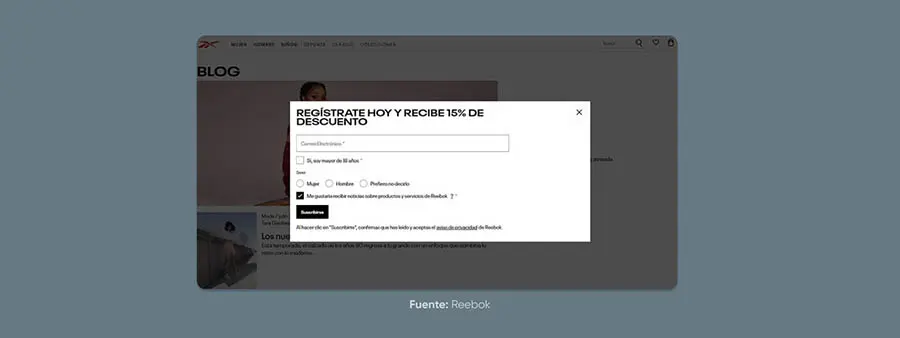 Otra forma de incluir suscriptores en tu lista de correo es ofreciendo un descuento generoso único. Este puede ser especialmente efectivo, ya que también incentiva a los usuarios a comprar tu producto inmediatamente.