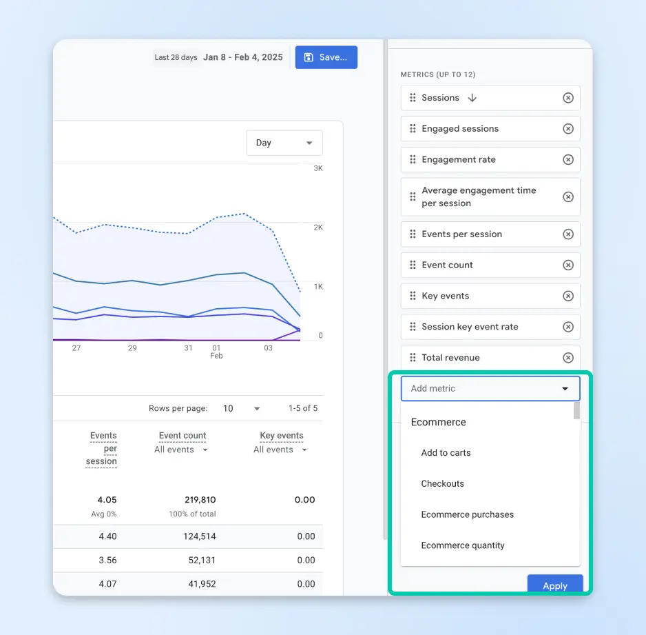 Puedes agregar más columnas o dimensiones haciendo clic en Métricas o Dimensiones en la sección DATOS DEL INFORME.