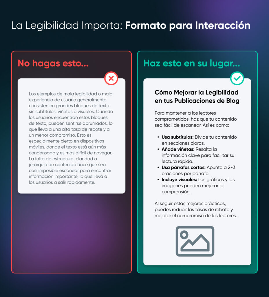 Bloques grandes de texto sin subtítulos, viñetas o elementos visuales pueden abrumar a los lectores. Una publicación que ofrezca una mala experiencia de usuario o que sea incómoda de leer puede generar altas tasas de rebote, especialmente en dispositivos móviles.