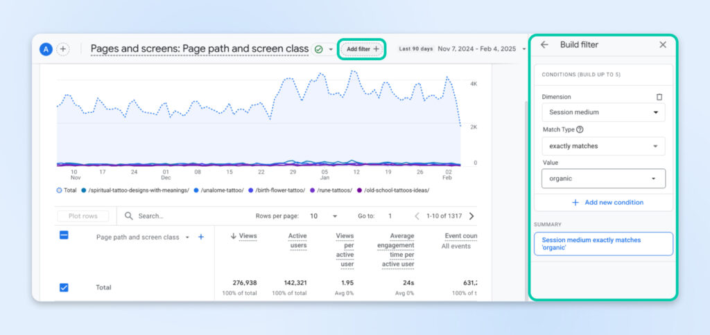 Añade un filtro para “Medio de sesión = orgánico” si solo quieres analizar el tráfico proveniente de los motores de búsqueda. También puedes buscar tráfico orgánico en redes sociales, tráfico directo, etc.