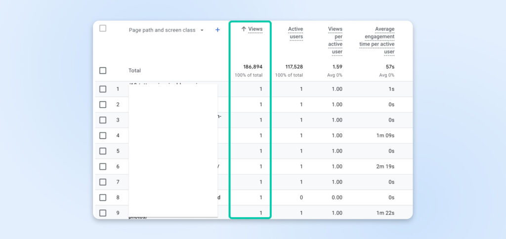 Con tu vista configurada, examina cuidadosamente tus patrones de tráfico. Haz clic en la columna de Vistas para ordenar las filas en orden ascendente o descendente según las vistas.