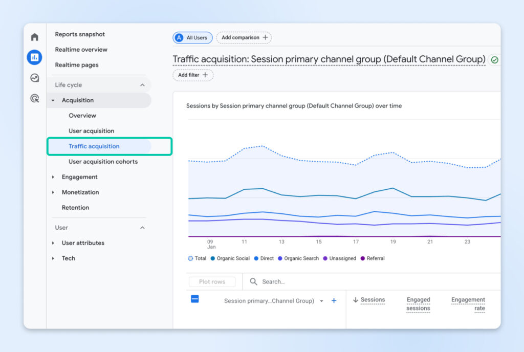 Cambia a Ciclo de vida > Adquisición > Adquisición de tráfico para comprender qué tan bien convierten tus publicaciones a los visitantes en clientes o suscriptores.