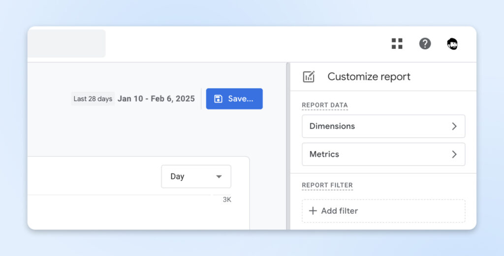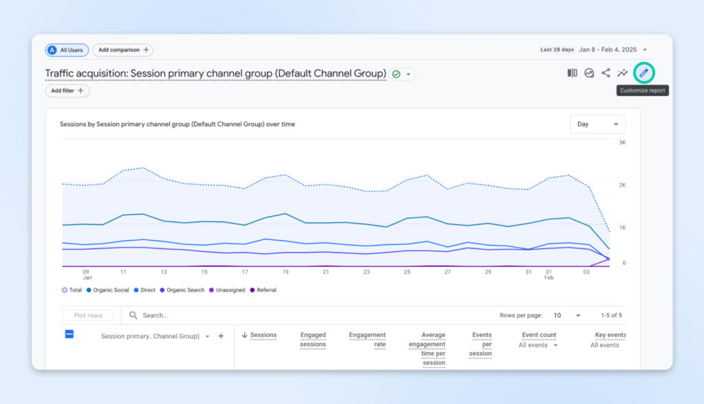 Puedes personalizar las columnas y los puntos de datos que ves en un informe haciendo clic en el icono Personalizar informe en cualquier informe en el que ya estés.