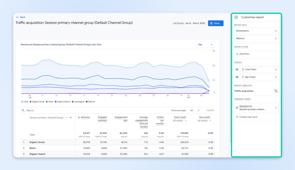 No tienes que depender solo de los informes predeterminados. GA4 es muy flexible y te permite crear informes personalizados con los datos que necesitas en una sola pantalla.