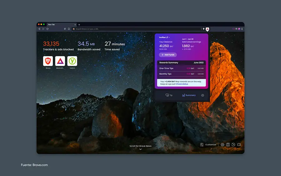 Brave gana dinero mediante anuncios, que aparecen en partes del navegador, como la ventana de una pestaña nueva. Y te dan Brave Rewards si los ves, o interactúas con ellos.