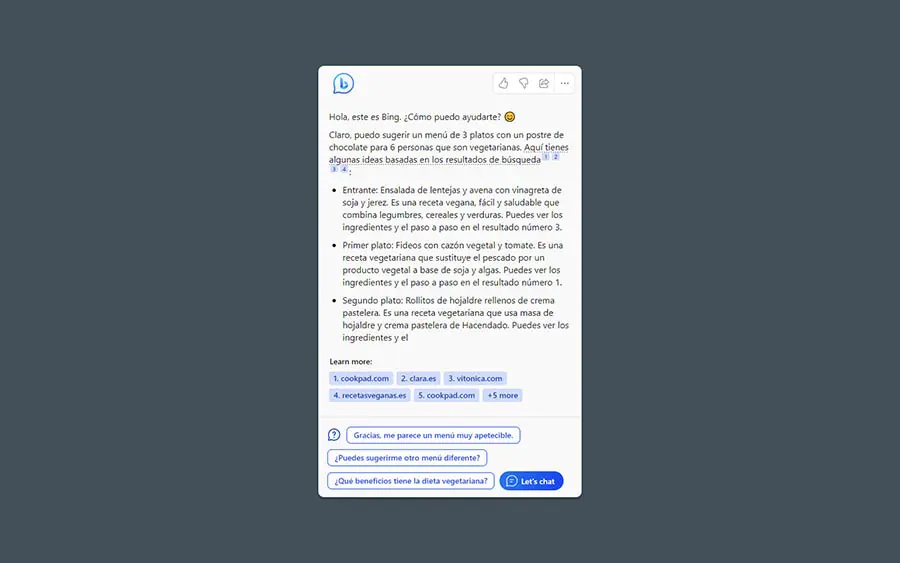 El “nuevo” Bing ofrece una interfaz conversacional. Haz preguntas, obtén resultados y refínalos un poco más. La IA dará respuestas automáticamente, vinculando fuentes y sitios web relevantes al texto.