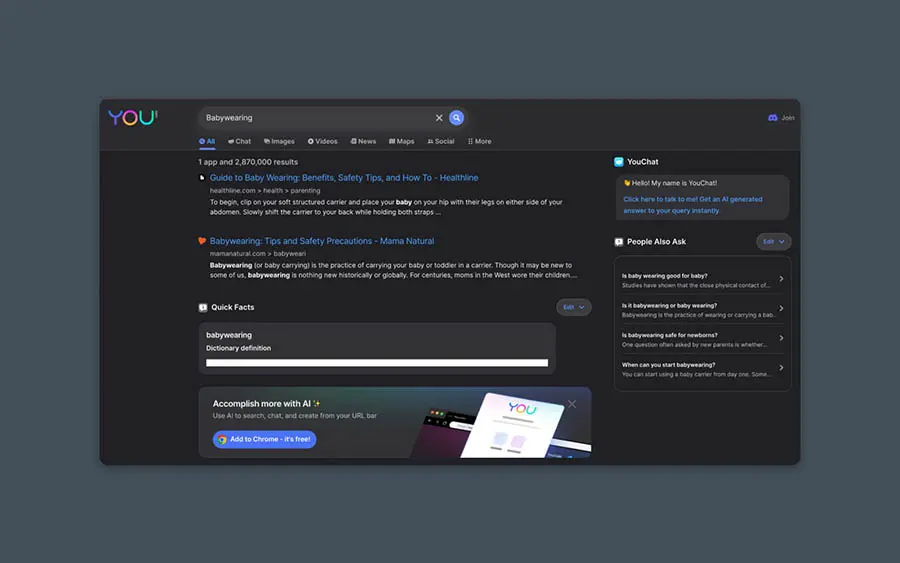 Este motor de búsqueda impulsado por IA ofrece una interfaz de chat y una página de resultados de búsqueda (SERP) bastante tradicional. De hecho, luce como la de Google. Por lo tanto, te sentirás cómodo con sus familiares características e interfaces.