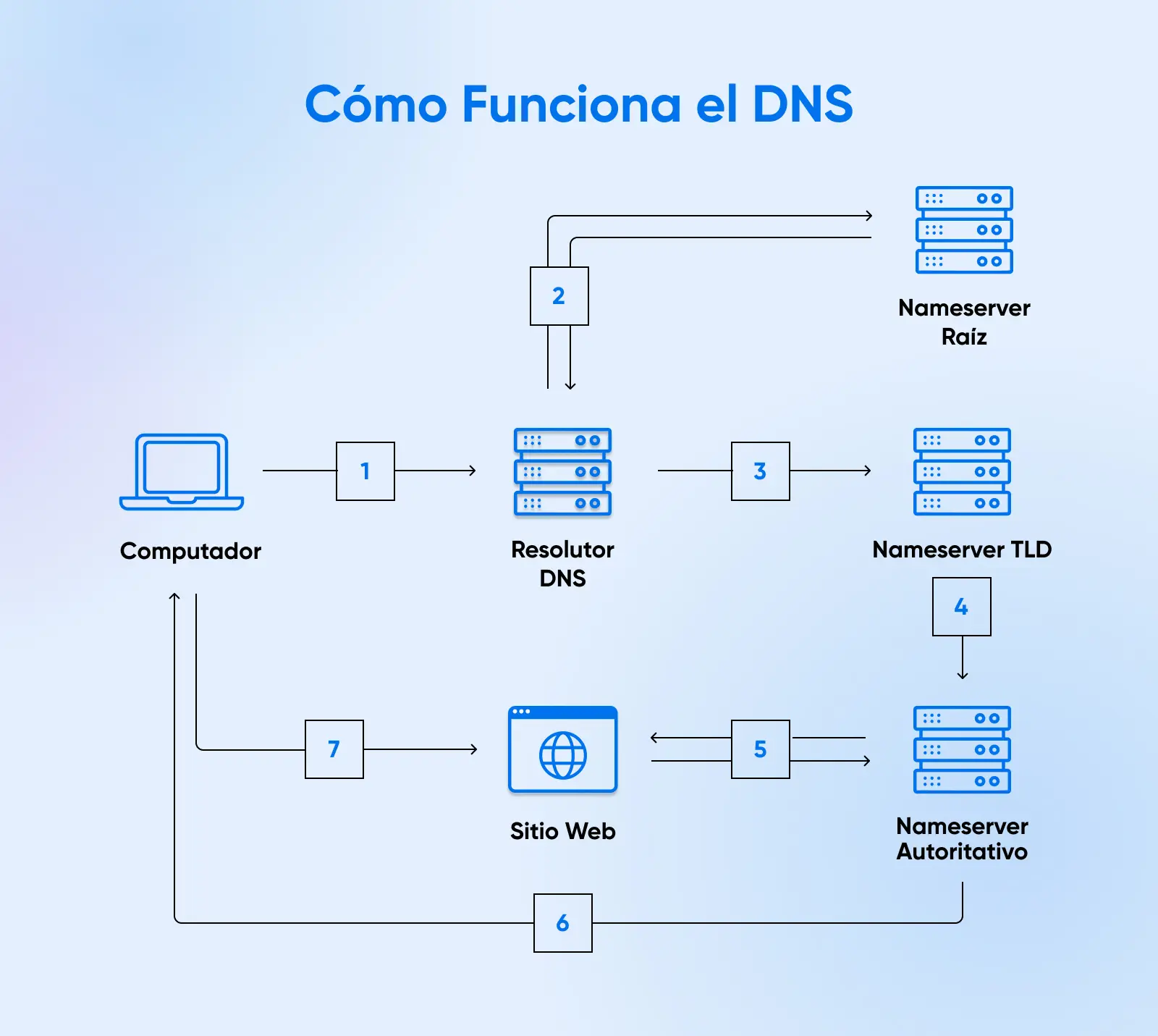 Un nameserver conecta tu nombre de dominio con una dirección de Protocolo de Internet (IP) del servidor que aloja tu sitio web. Gracias a los nameservers, navegadores como Google Chrome y Mozilla Firefox pueden dirigir a los usuarios a la página correcta cuando escriben la dirección de un sitio web.