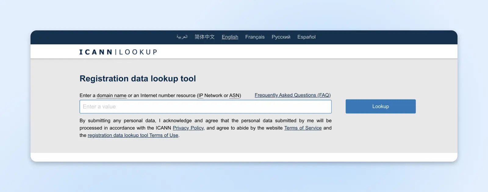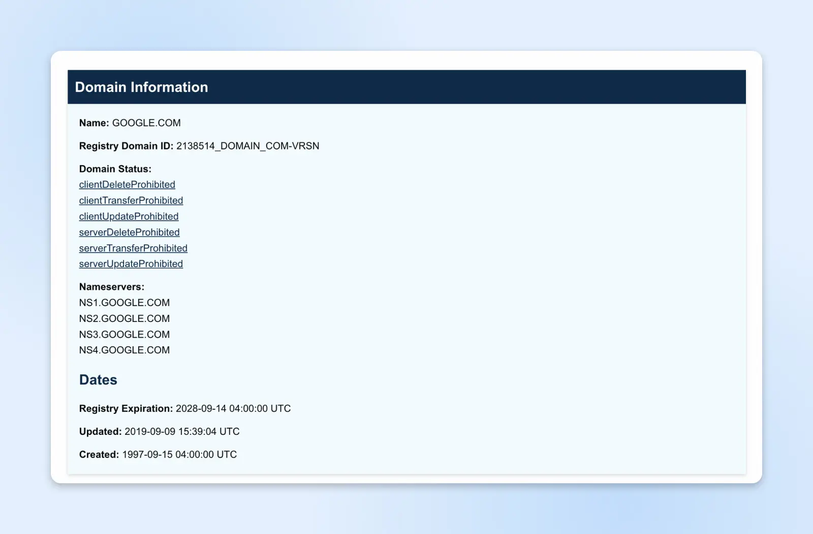 Alternativamente, puedes descubrir cuáles son los nameservers de un sitio web al realizar una búsqueda WHOIS. Los nameservers son registros públicos, entonces es posible encontrar esta información usando una herramienta de terceros.