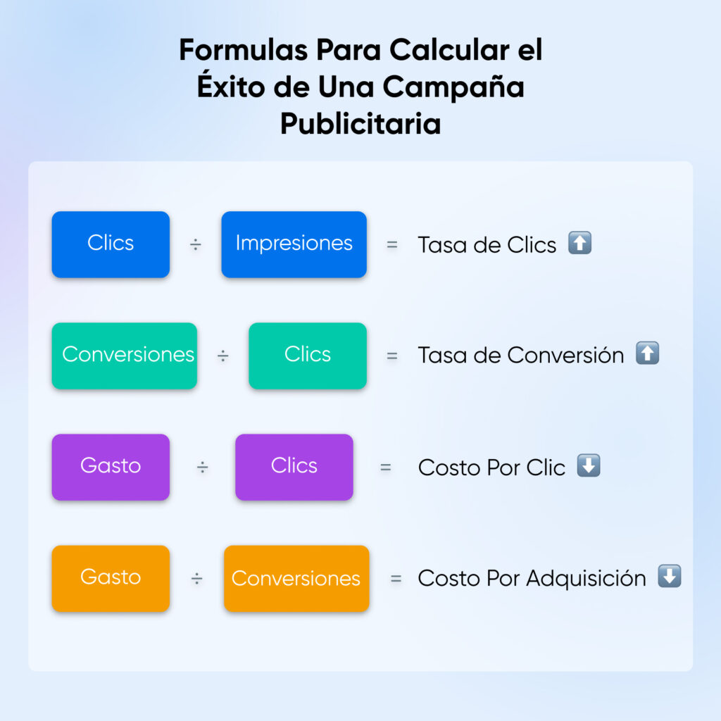 - Tasa de conversión: El porcentaje de conversiones por clic. Una campaña exitosa mantiene este número bajo. Encuentra la tasa de conversión con otra fórmula simple: Conversiones ÷ Clics.