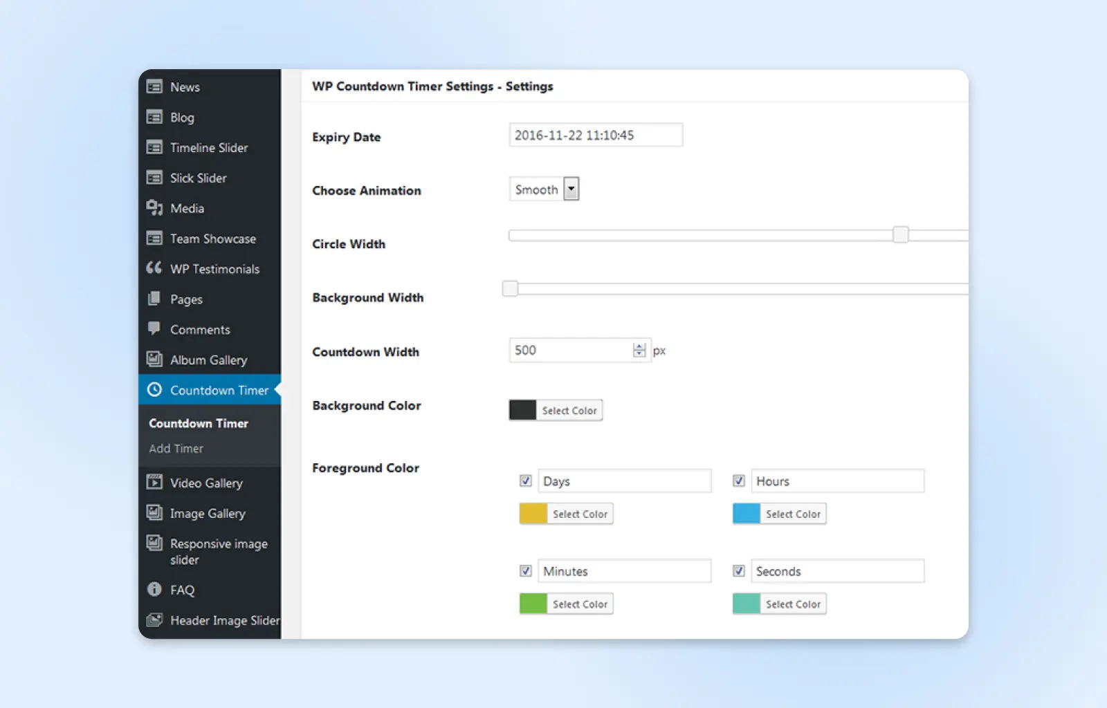 Panel de administración de WordPress que muestra la configuración del complemento del temporizador de cuenta regresiva con opciones de fecha de vencimiento, colores y visualización.