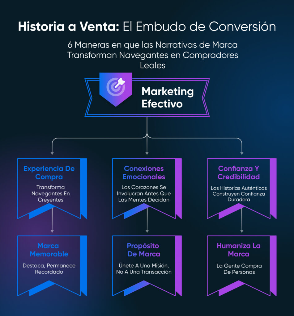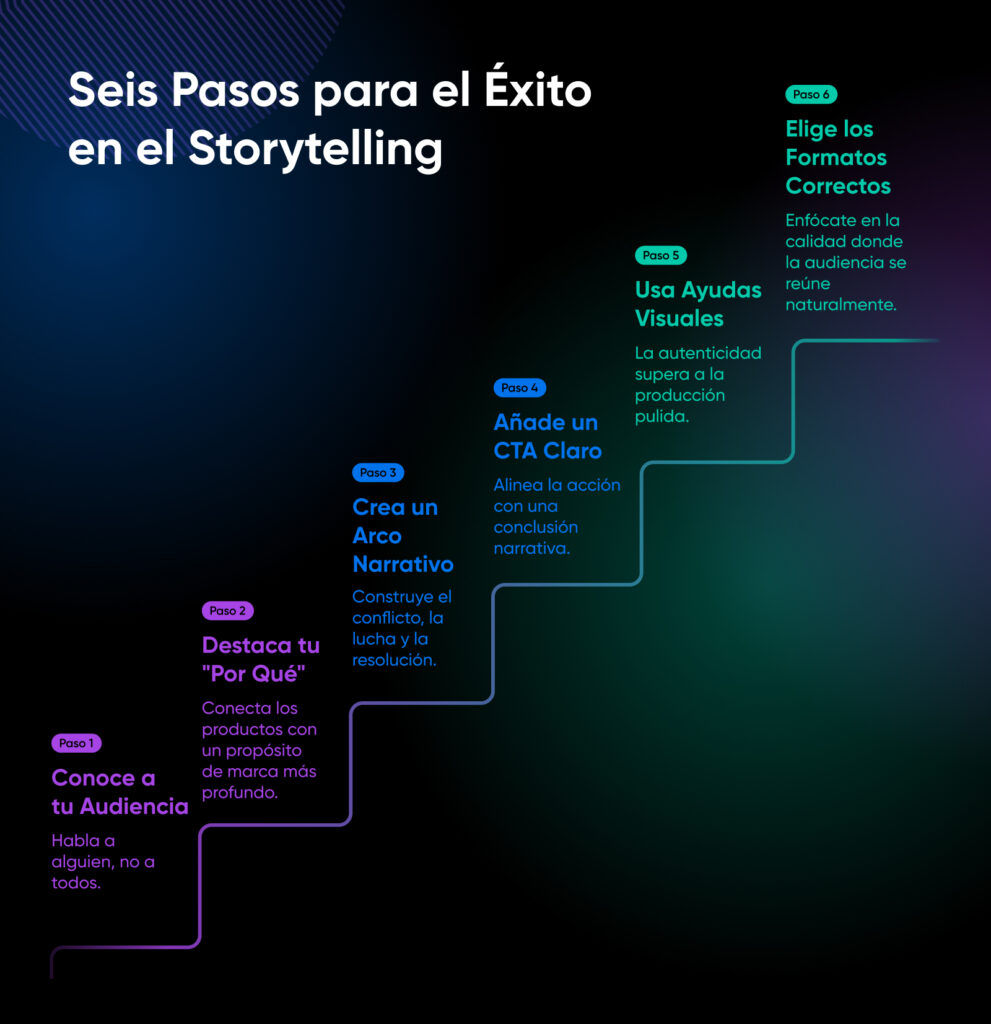 En lugar de puntos secos o copias de ventas, creas una narrativa que apela a la emoción, la identidad o la curiosidad. El desafío de tu cliente se convierte en el conflicto de la historia, mientras que tu producto los guía hacia una resolución.