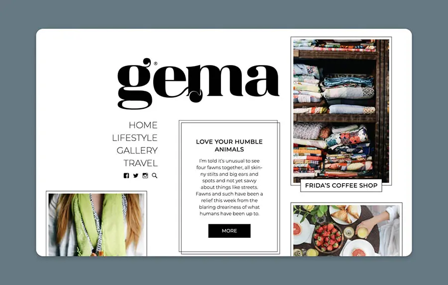 Abrir un sitio hecho con Gema es como ver las páginas de una glamorosa revista. Tiene fuentes elegantes, espacios en blanco y grandes imágenes.