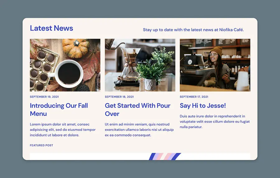 Aunque fue pensado para sitios web de cafeterías y restaurantes, puedes adaptar fácilmente Tove para tu blog. Puedes “jugar” con su diseño predeterminado, aunque es bastante limpio, tiene fuentes de fácil lectura y más de 40 patrones de bloques preestablecidos.