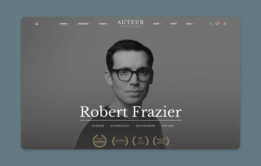 Este tema cuenta con un diseño único para tus páginas de inicio, que realmente ayudará a tus libros nuevos y lanzamientos, a resaltar. También incluye una sección biográfica para el autor y un área para incluir enlaces de comercio electrónico afiliado (como Amazon).