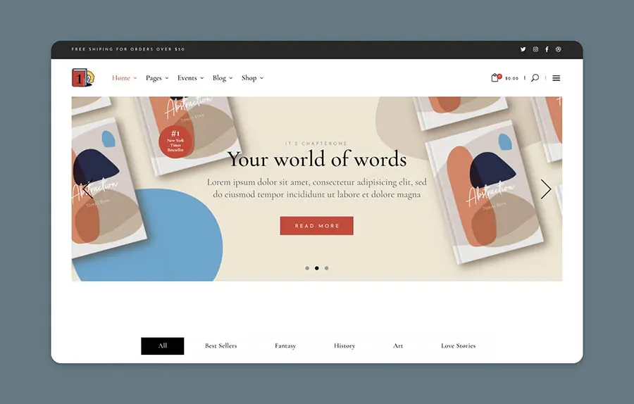 Esta plantilla está enfocada, más que nada, en vender libros. Te permite promocionar fácilmente eventos de autores, así como configurar tu propia tienda en línea