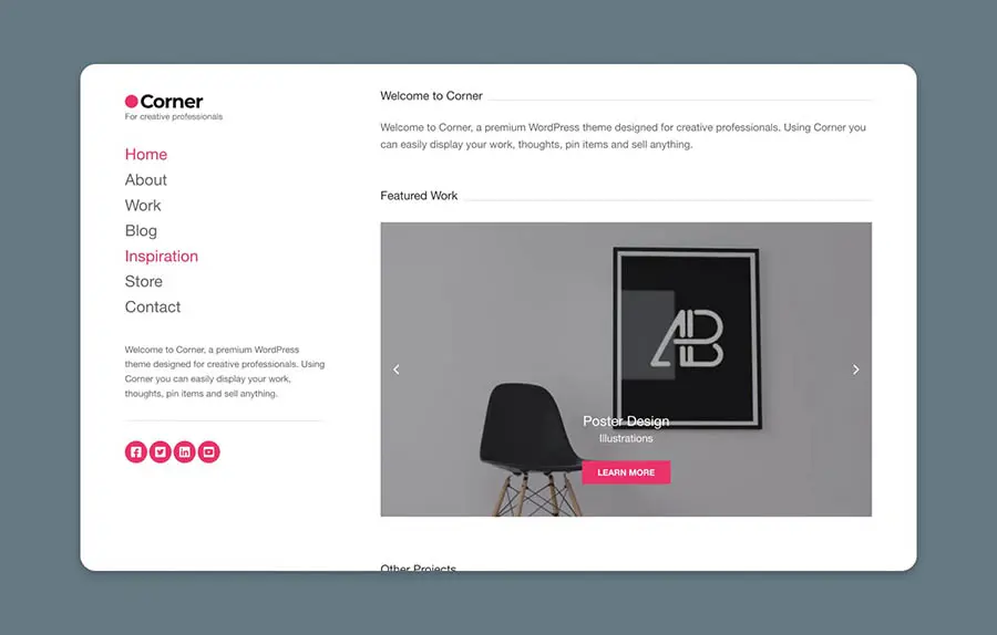 Una parte clave para asegurar un trabajo como escritor, es impresionar posibles clientes con tu obra previa. Corner tiene una sección de portafolio para esto, con varias opciones de diseño de donde elegir.