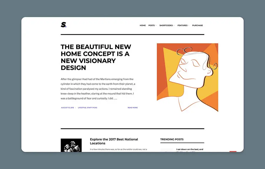El diseño aquí es nítido y minimalista, aunque maneja toques de color para algunos elementos clave. Podrás crear entonces, un blog atractivo, con secciones predefinidas y construir allí múltiples barras laterales.