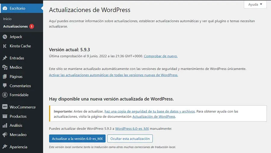 En este ejemplo, todos los plugins y temas se encuentran al día, pero sí hay una versión nueva de WordPress disponible. Típicamente, recomendamos que actualices WordPress a las nuevas versiones, tan pronto se encuentren disponibles. Lo único que debes tener en cuenta es que siempre es necesario hacer una copia de seguridad de tu sitio web antes de actualizar WordPress.