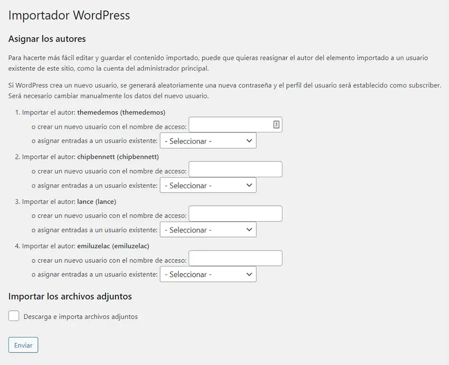 En la siguiente página, tendrás la opción de seleccionar el archivo XML que creaste antes. Una vez que selecciones el archivo, WordPress te preguntará a qué autores quieres asignar el contenido que estás importando: