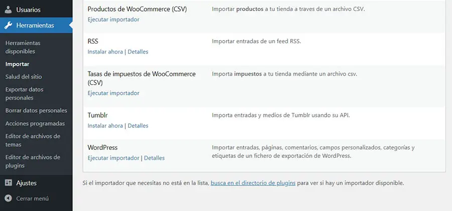 Una vez que generes el sitio nuevo, puedes importar ese archivo yendo a la pestaña de ‘Herramientas > Importar’ en WordPress. Selecciona el enlace que dice ‘Ejecutar importador’ bajo la opción de WordPress: