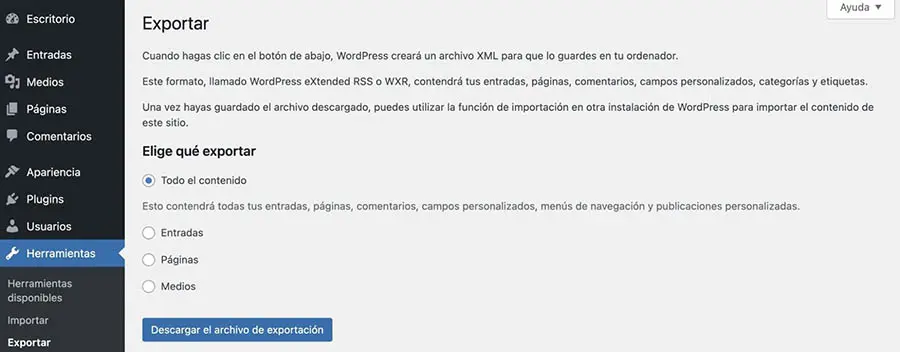Si estás pensando en reconstruir tu sitio sin perder el contenido existente, WordPress te permite exportarlo. Para hacer esto, navega a la pestaña de ‘Herramientas > Exportar’ en el escritorio de WordPress. Aquí puedes elegir que componentes de tu sitio quieres exportar: