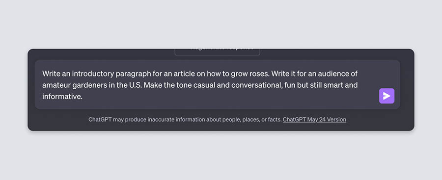Por ejemplo, si tu sitio habla de jardinería y deseas escribir sobre “cómo cultivar rosas”, puedes pedir a ChatGPT algo tipo: “Crea un esquema para un artículo sobre el cultivo de rosas” o “Escribe un párrafo introductorio para un artículo sobre cómo cultivar rosas”. Incluso, puedes añadir más detalles a tu solicitud.