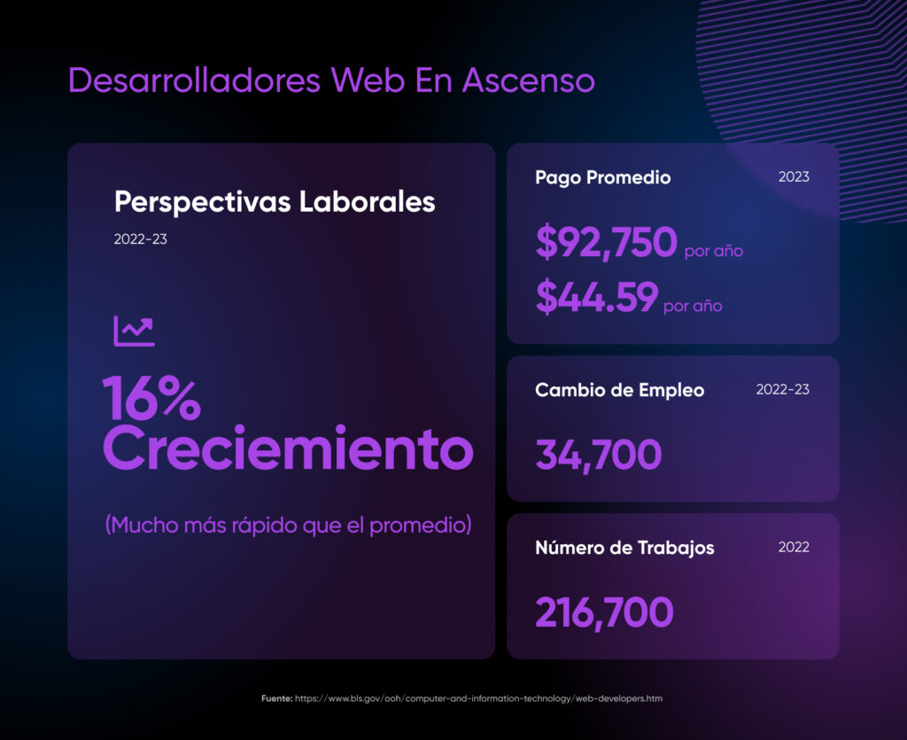Comprender HTML abre la puerta a numerosas oportunidades laborales en la industria tecnológica. Según la Oficina de Estadísticas Laborales, se proyecta que el empleo para desarrolladores web crezca un 16% entre 2022-2032, mucho más rápido que el promedio en todas las ocupaciones. Esta habilidad fundamental es esencial no sólo para el desarrollo web, sino también para roles en marketing digital, diseño UX/UI y gestión de contenidos.