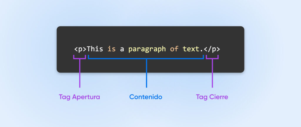 Observe cómo cada elemento tiene una etiqueta de apertura y una etiqueta de cierre correspondiente y cómo los componentes están anidados entre sí para crear la estructura del documento.