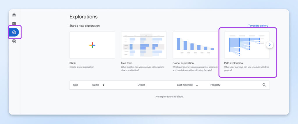 Inicia sesión en tu propiedad de Google Analytics 4. Ve a Explorar > Exploración de rutas.