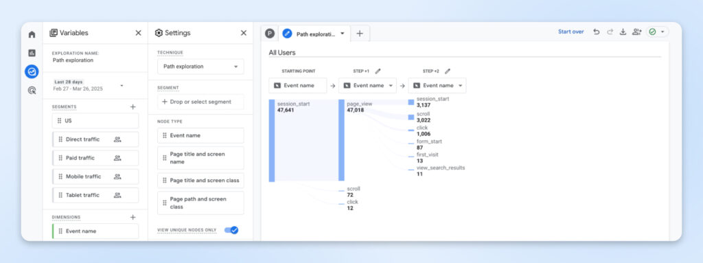 - Mapea su recorrido actual utilizando los informes de exploración de rutas y embudos de GA4