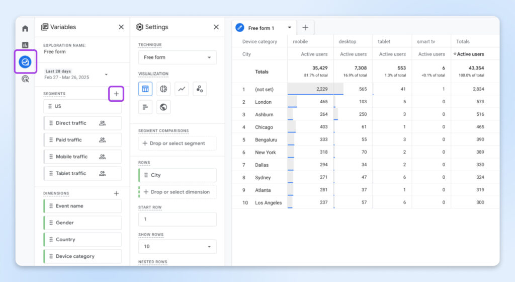 Verás un informe de formulario libre predeterminado creado. Para agregar nuevas columnas o puntos de datos, encuentra los segmentos en la columna “Variable” y haz clic en +.