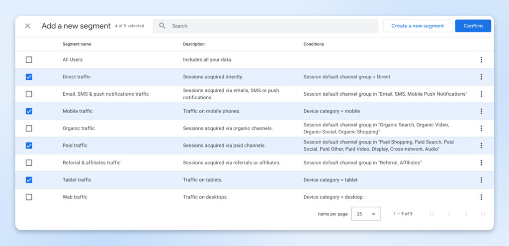 GA4 ofrece tres tipos de segmentos que proporcionan diferentes perspectivas sobre el recorrido de tus clientes, revelando cómo los distintos grupos de usuarios experimentan tu sitio.
