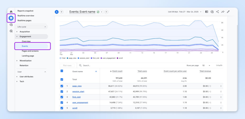 - Todo es un evento: Desde vistas de páginas hasta clics en botones y reproducciones de videos, GA4 lo captura todo en un formato consistente.